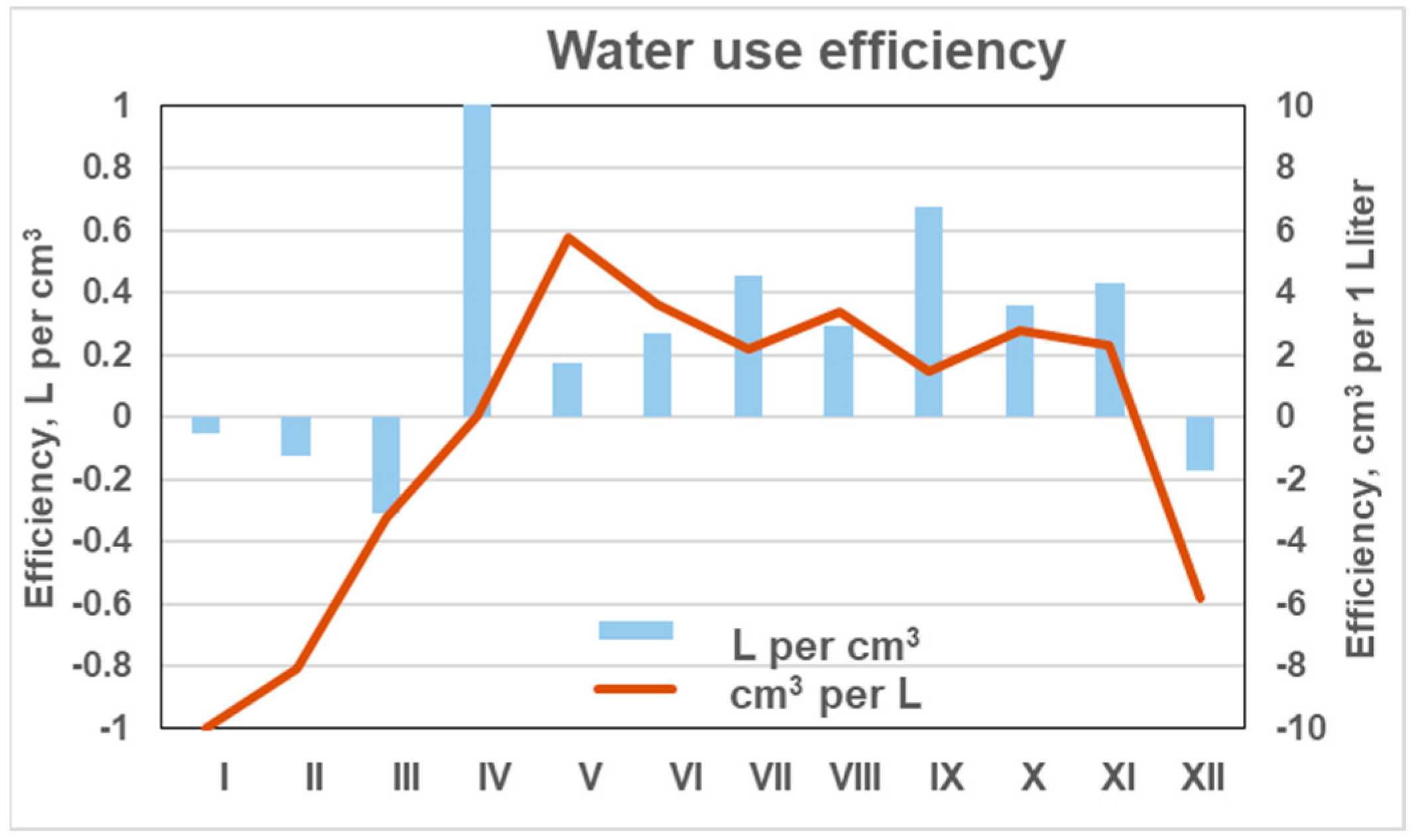 Variations in WUE expressed as liters per cm3 of stem volume revealed similar patterns. During the vegetation period, trees used approximately 300 mL of water to produce 1 cm3 of timber. Elevated values of this index were observed at the beginning of the vegetation period in April, when growth had not yet commenced, indicating an excess water supply relative to increment.