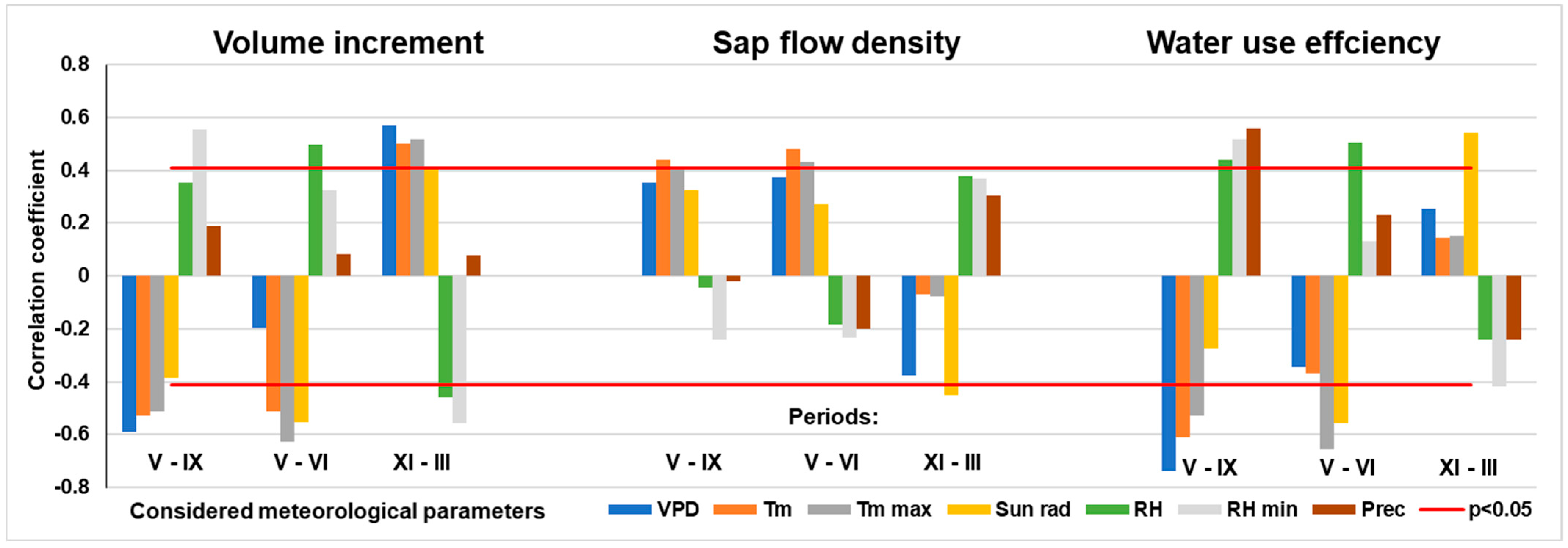 p < 0.05). These results indicate that differently from stem volume increment the highest sap flow intensity across all three parts of the season determined the maximum annual sap flow density (yellow columns in