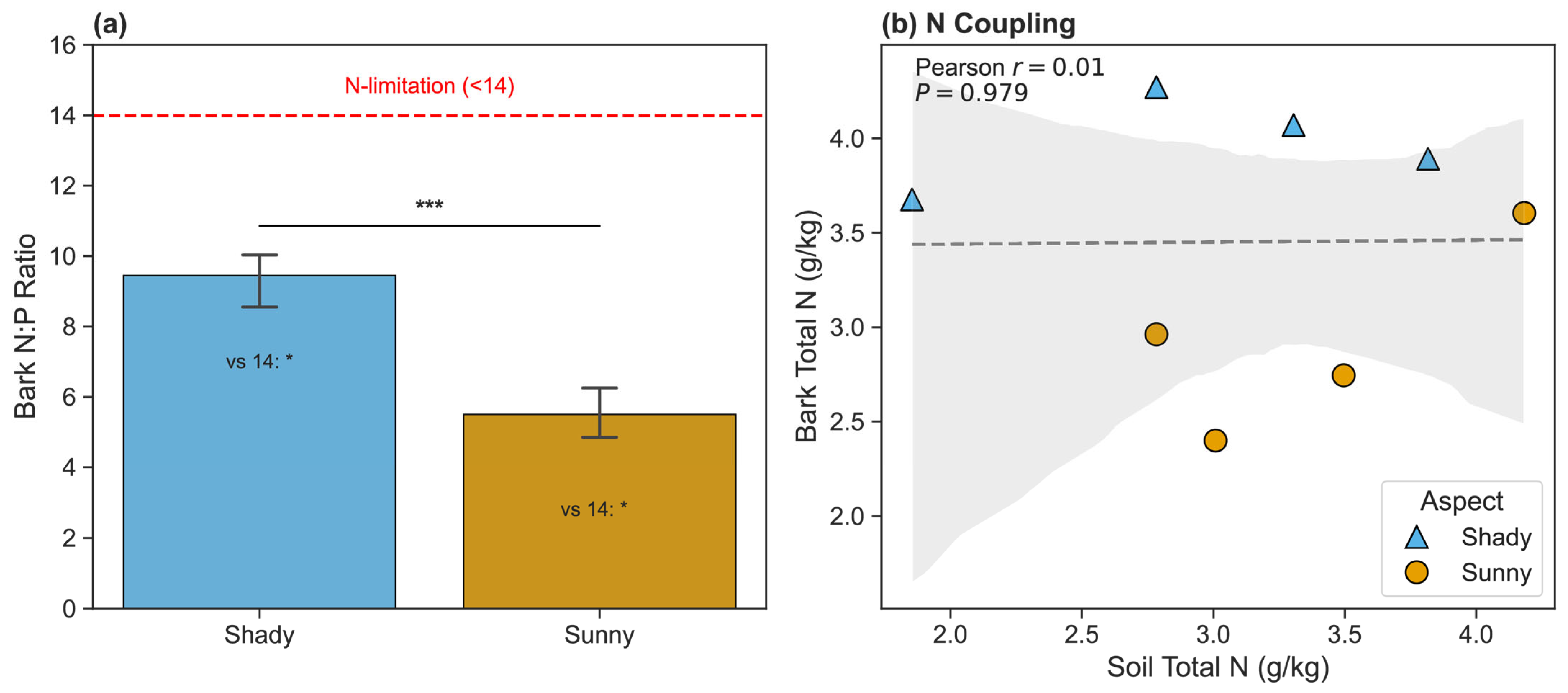 - Bark stoichiometric traits will change from a resource-acquisitive pattern (high nitrogen) on the shady slope to a conservative/defensive pattern (high C/N ratio) on the sunny slope, primarily due to microclimatic differences rather than soil nutrients.