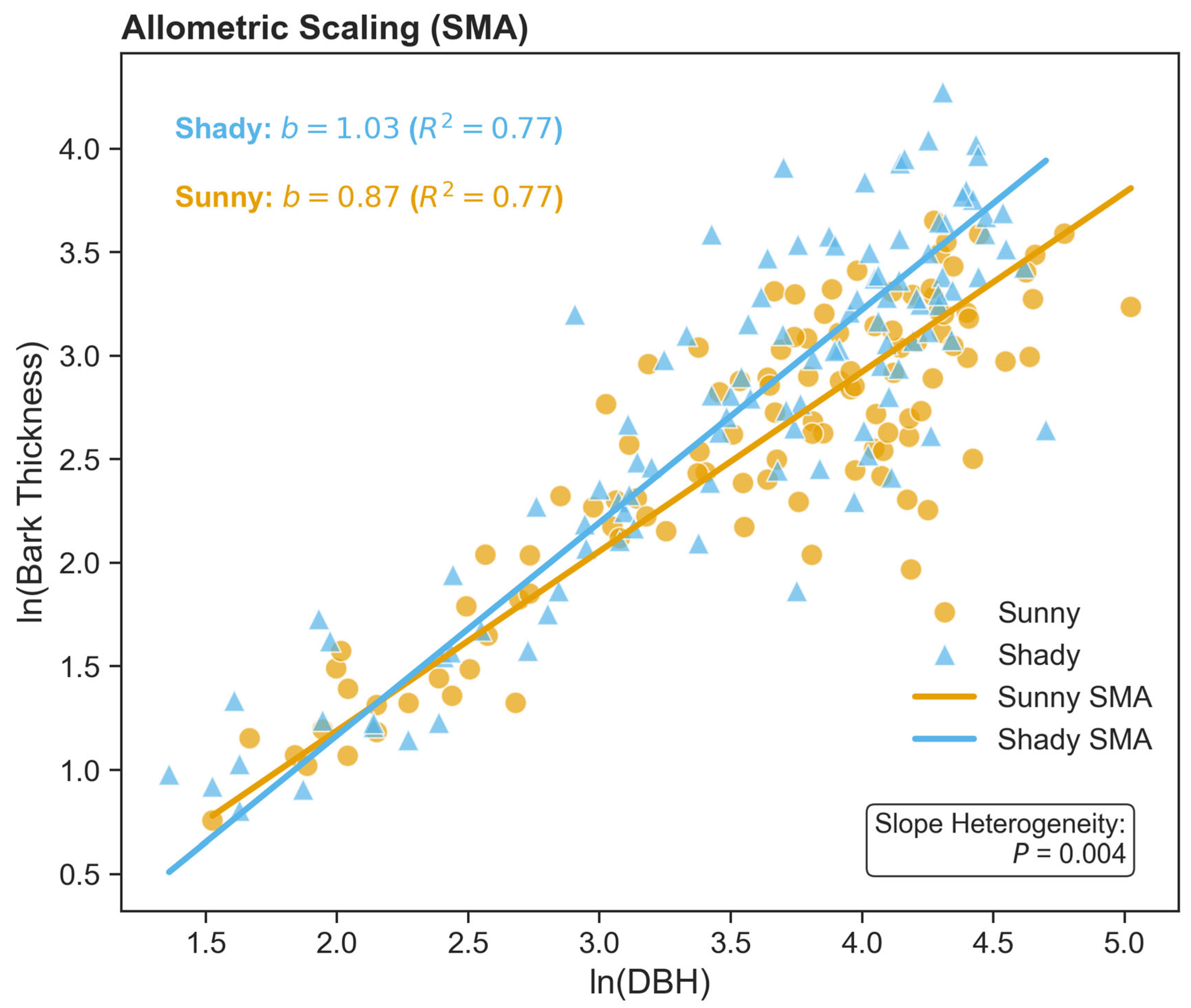 - The allometric scaling relationship for bark thickness is not fixed but flexible; specifically, we expect isometric scaling () on shady slopes for thermal maintenance and allometric scaling () on sunny slopes for hydraulic safety.