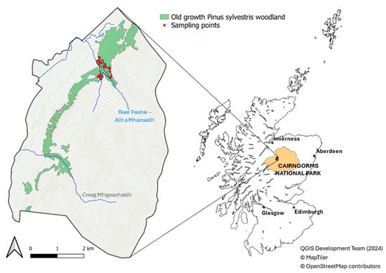 The study was performed in an area of old-growth Scots pine forest at the UK Environmental Change Networks Allt a’Mharcaidh long-term monitoring site (https://deims.org/5a04fee1-42aa-47e9-abfc-043a3eda12ac; accessed on 18 November 2025), located in the Invereshie and Inshriach National Nature Reserve, Cairngorms National Park, Scotland (57°20 N, 3°61 W; Figure 1). The site formed part of a large, near-contiguous belt (340 m to 550 m a.s.l.) of old-growth Scots pine forest (Figure 2), approximately 1339 ha in size, which occupied the lower slopes of the Cairngorm massif between Glen Feshie and Gleann Eanaich. The wider Glen Feshie Forest is the largest remaining tract of the ancient Caledonian pine forest that colonized Scotland following the last ice age 10,000 years ago [28]. Pollen counts have been used in conjunction with stomatal counts to explore the process of Pinus colonization and its increase to form woodland. These studies confirm that Pinus is present from 9600 B.P. and dominates woodland from 9150 B.P. [29].