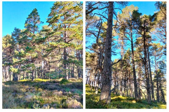 The underlying soils were mostly thin peaty podzols over glacial deposits, with a bedrock of porphyritic granite. The main forest type is a Scots pine-dominated forest characterized by an average stem density equal to 18.4 stems ha−1 almost entirely made up of Scots pine trees (more than 95% in terms of basal area) with sporadic presence in the more open areas (lower canopy closure) of downy and silver birch (Betula pubescens Ehrh, Betula pendula Roth), and common juniper (Juniperus communis L.). According to the Cairngorms National Park Forest Strategy 2018, the management guidelines plan to continue to protect the ancient forests from further damage and fragmentation and pay particular attention to the ecological significance of Caledonian pine forests [30]. The study area is characterized by a diversity of wildlife, among whose most representative species are capercaillie (Tetrao urogallus L.) and black grouse (Lyrurus tetrix L.) among the birds, the Scottish wildcat (Felis sylvestris Schreber), pine marten (Martes martes L.), red deer (Cervus elaphus L.), and roe deer (Capreolus capreolus L.) among the mammals.