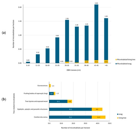 Number of tree-related microhabitats (TreMs) by DBH class on standing dead and living trees (a) and number of tree-related microhabitats (TreMs) by categories per hectare (b).