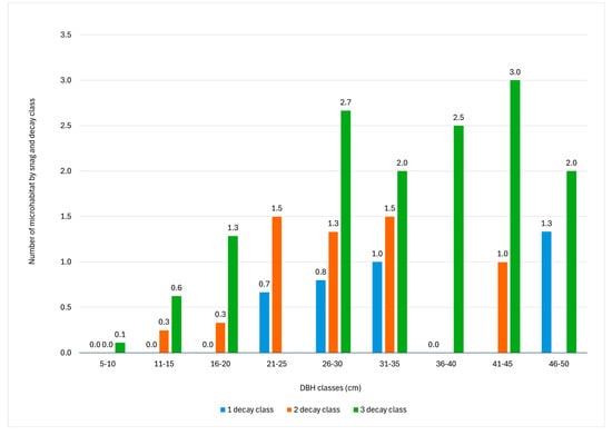 The results showed that the number of TreMs is related to the DBH and decay class of the snag (Figure 5). In fact, the number of TreMs ranges between 0.05 per snag with a DBH under 10 cm and 2.00 per snag with a DBH of 41–45 cm. Concerning decay class, only the first three decay classes of snags were considered because none were identified for the last two classes (fourth and fifth). The highest abundance of TreMs was found in DBH class 21–35 cm for the first and second decay classes, while for the third decay class, the highest abundance was found for the snag DBH class greater than 40 cm. In addition, the number of TreMs per snag increased with the decay class: 0.35 for the first decay class, 0.95 for the second decay class, and 1.09 for the third decay class, which generally exhibits the highest number of TreMs across all DBH classes.