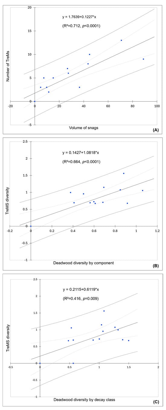 Scatter plot of the three simple linear regression models between: (A) volume of snags (X) and number of TreMs (Y), (B) deadwood diversity by component (X) and TreMs diversity (Y), and (C) deadwood diversity by decay class (X) and TreMs diversity (Y).