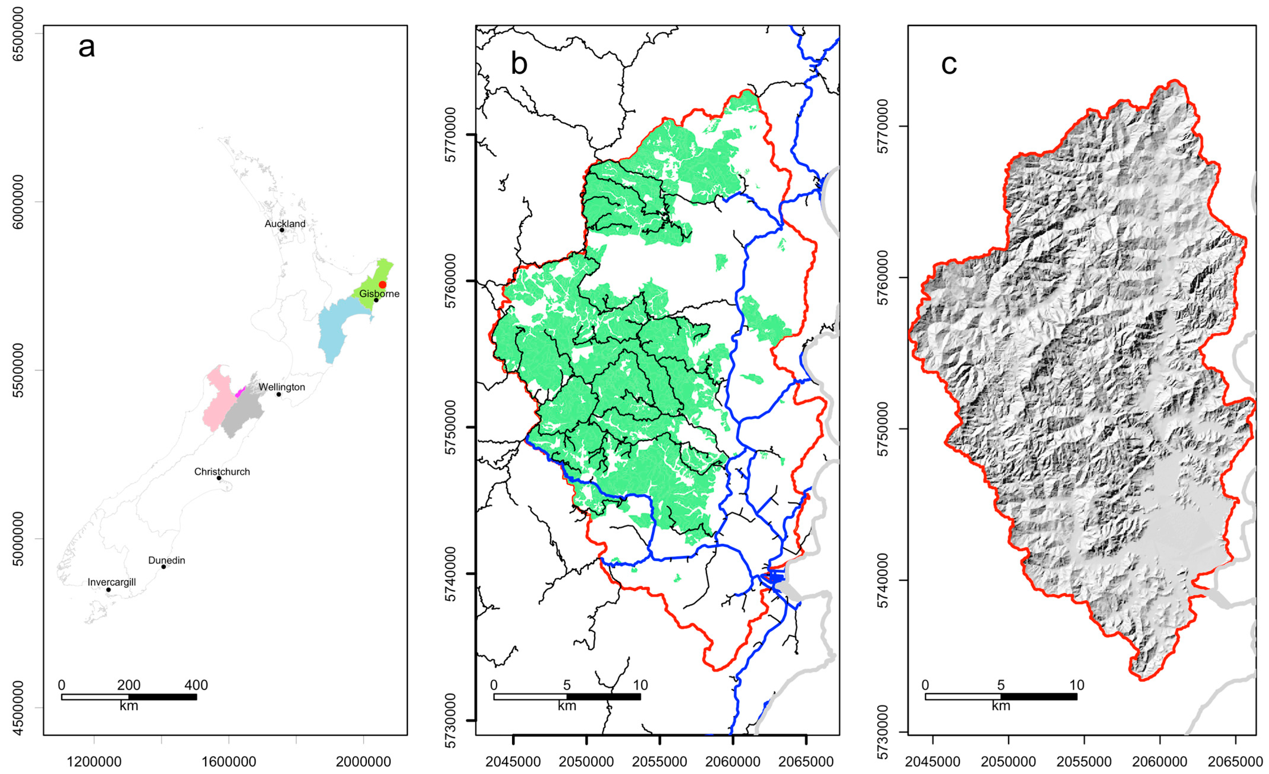 Study limitations present several opportunities for further investigation. First, reshaping current forest stands to HSUs may take a few years and some planning for harvesting and the plantation establishment. Therefore, taking the decision today to start a catchment-oriented harvest scheduling will not give immediate results and will need a transition period. Second, two or more forest owners may be present in a given CMU, and therefore, harvest scheduling would need coordination between them. We may find that some CMUs are only controlled by one forest owner, and that some CMUs may have several forest owners, where trade-offs might be necessary. Third, we have not modelled temporal variability in storm frequency and intensity, which climate change projections suggest may increase in New Zealand [