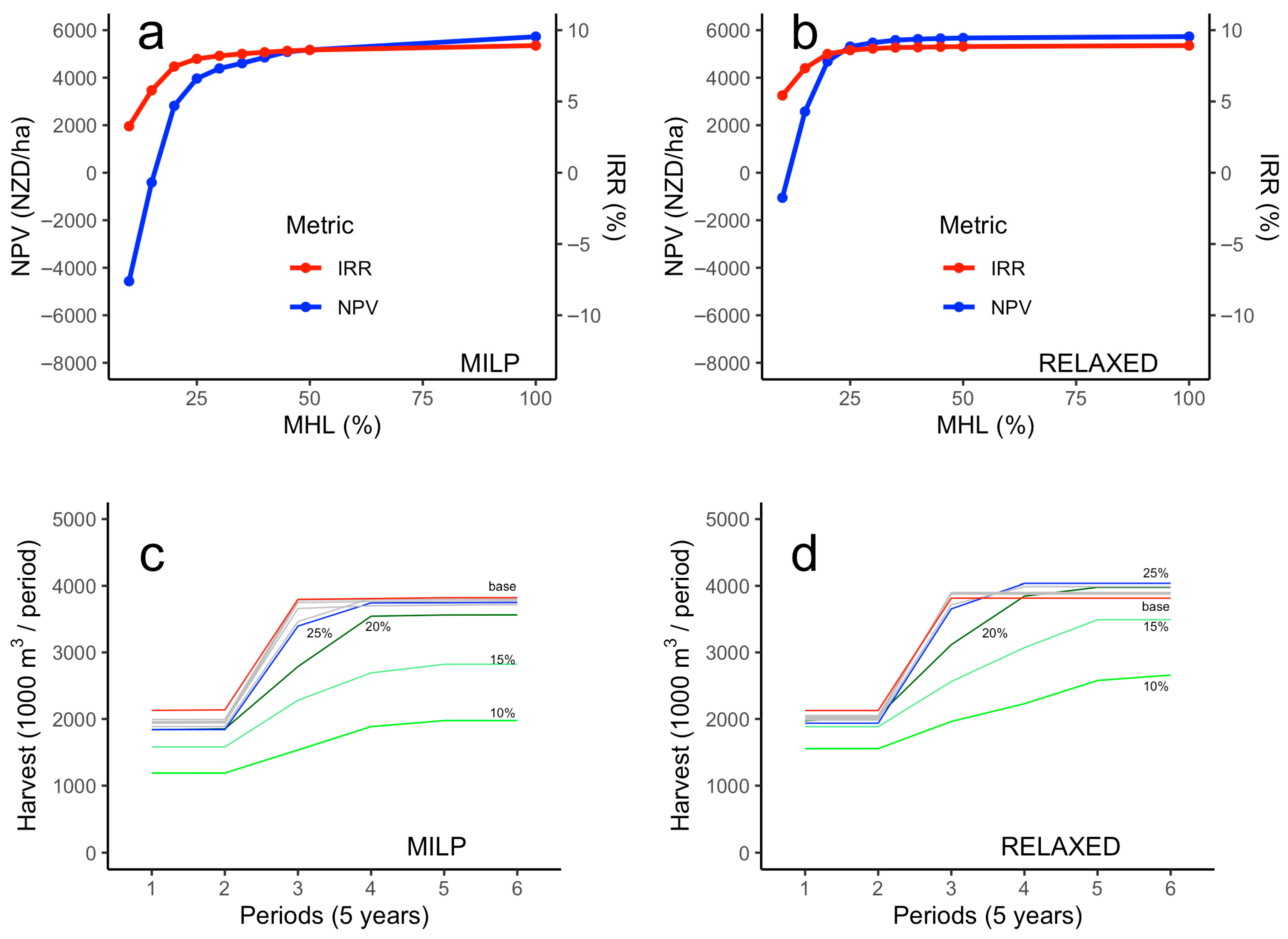 Once HSUs and CMUs are defined, a limit can be placed on the maximum area that can be clearfell harvested in any single period along the planning horizon within each CMU. We have called this threshold the Maximum Harvest Level (MHL), expressed as a fraction of any CMU, e.g., MHL 15% means that not more than 15% of any CMU could be harvested at any single 5-year period. For the base scenario, we ran a tactically explicit harvest scheduling model maximising the NPV subject to non-declining yield (NDY) constraints. We then ran further scenarios in which MHL constraints were added to the base simulation, testing MHLs in a series from 10% to 50% with 5% steps. Thus, for these new scenarios, we maximised the NPV subject to NDY and MHL constraints. Imposing the MHL constraints in the range 10%–20% drastically reduced profitability. In comparison, for MHLs 25% and larger, differences in profitability with the base scenario were relatively small. Based on the results of our study, we consider that an MHL of 25% struck a good balance between profitability and limiting the maximum area that could be harvested in any CMU in any single 5-year period.
