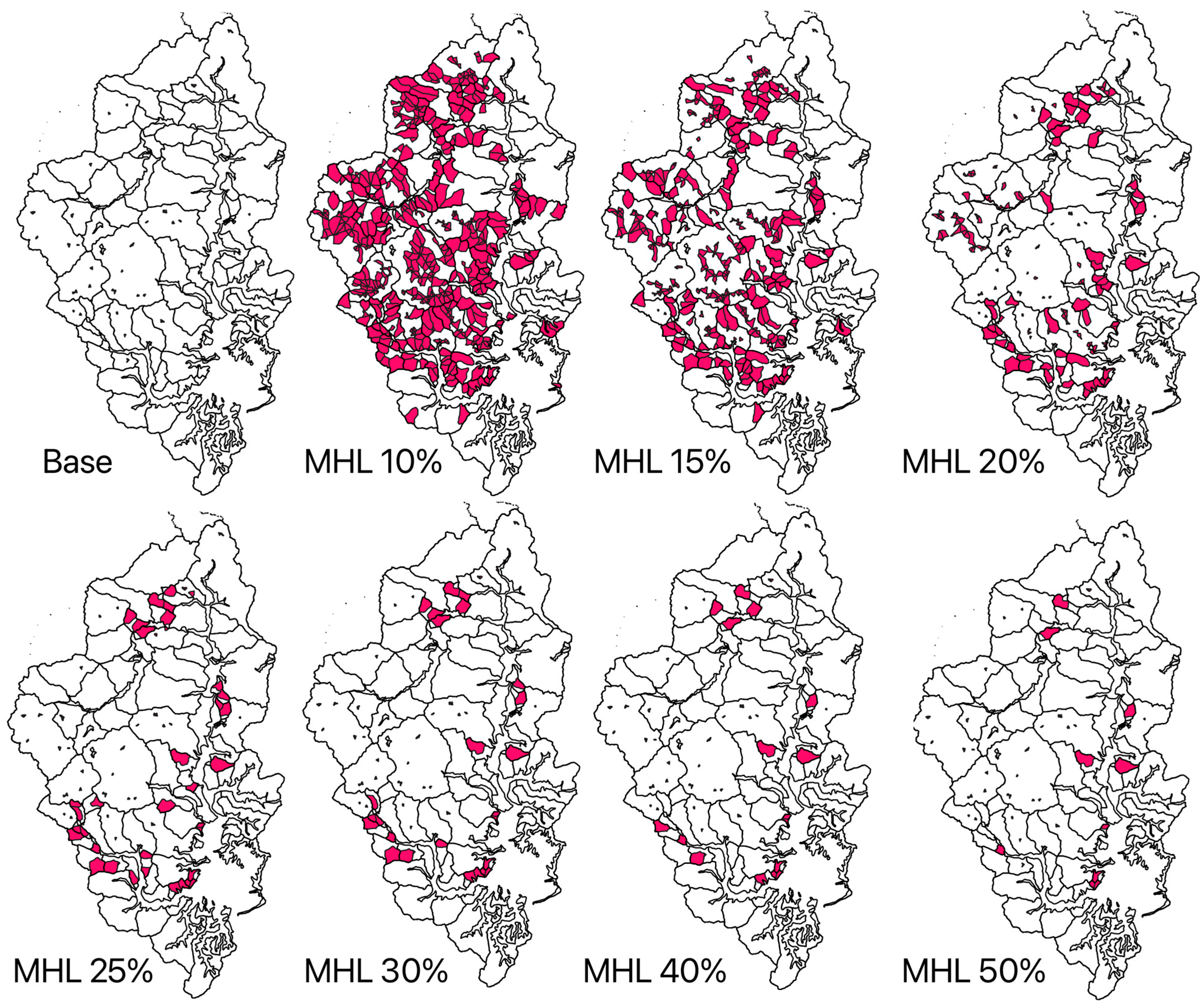 Following Cyclone Gabrielle, the Ministry for the Environment (2023) established the “Ministerial Inquiry into Land Use” (MILU) to address damage caused by woody debris and sediment in Tairāwhiti and Wairoa. Identifying a clear connection between clearfell logging and landslides on fragile terrain, the MILU proposed ending large-scale harvesting in these regions. Specifically, they recommended capping harvest plots (coupes) at 40 hectares and ensuring no more than 5% of any single catchment is clearfelled annually. We found that our model aligns well with MILU recommendations. The median of our 1123 HSUs is 20 ha, while 75% are below 39 ha. For those units exceeding 40 ha, we can enforce harvesting less than the whole HSU every year with continuous fraction variables in the range 0–1. In relation to the second part of the statement, i.e., no more than 5% of each CMU is harvested each year, our results also align well because an MHL of 25% means that over the 5-year planning period, the clearfell harvest is limited to 25% or 5% per year.