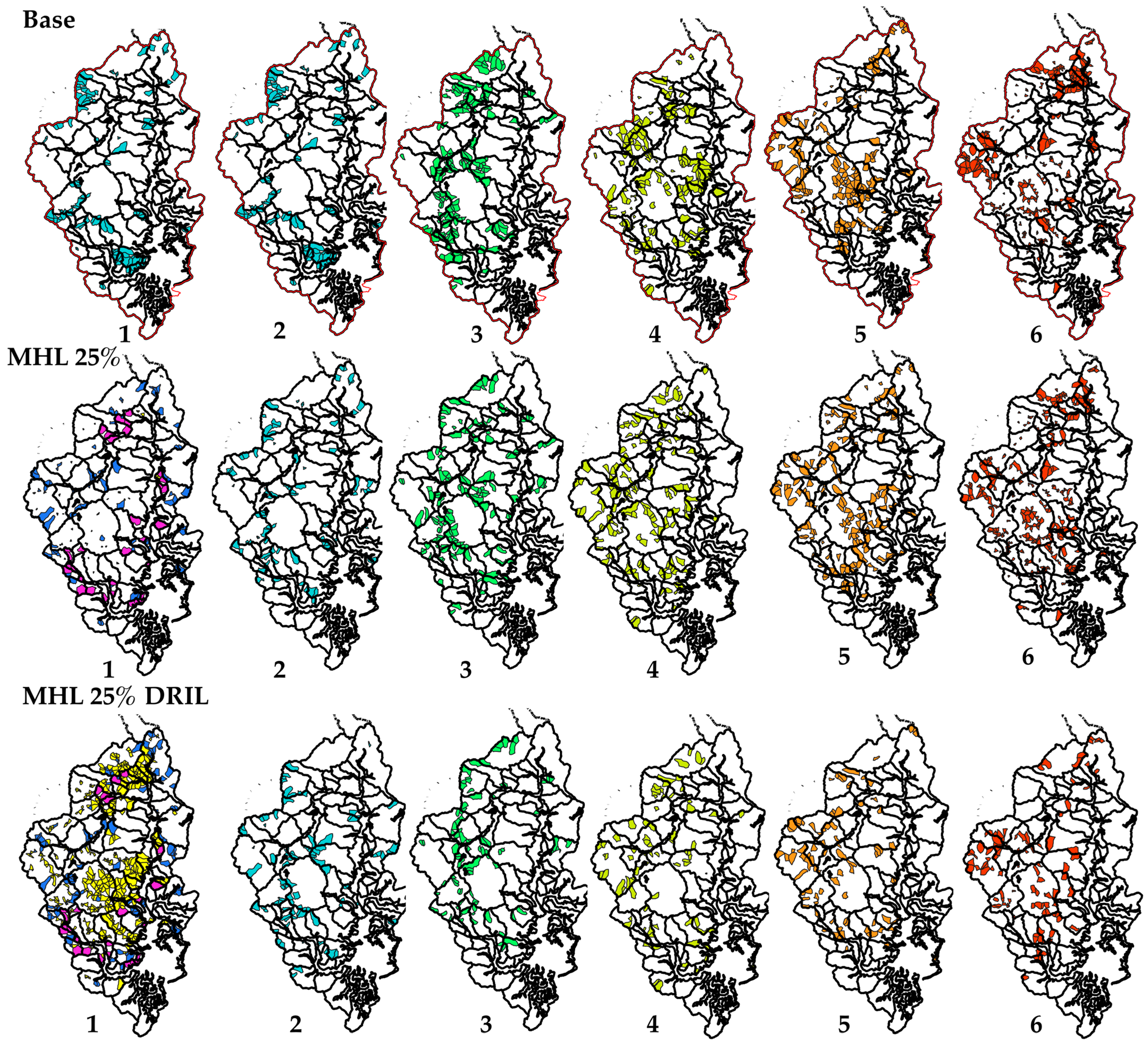 Taking the previous best catchment-oriented harvest schedule scenario (i.e., the one considered best within MHLs 10%–50%), we added a representation of rainfall-induced landslide susceptibility. This proxy was calculated as the cumulative sum of the HSU areas harvested times their RIL probabilities, for each period. We then tested declining and non-declining susceptibility constraints, and aggregated susceptibility allowed to vary by no more than 10% from one period to the next. The idea behind this policy will be to spread the RIL susceptibility of the landscape over time, so that we do not observe periods of high susceptibility followed by periods of lower susceptibility.