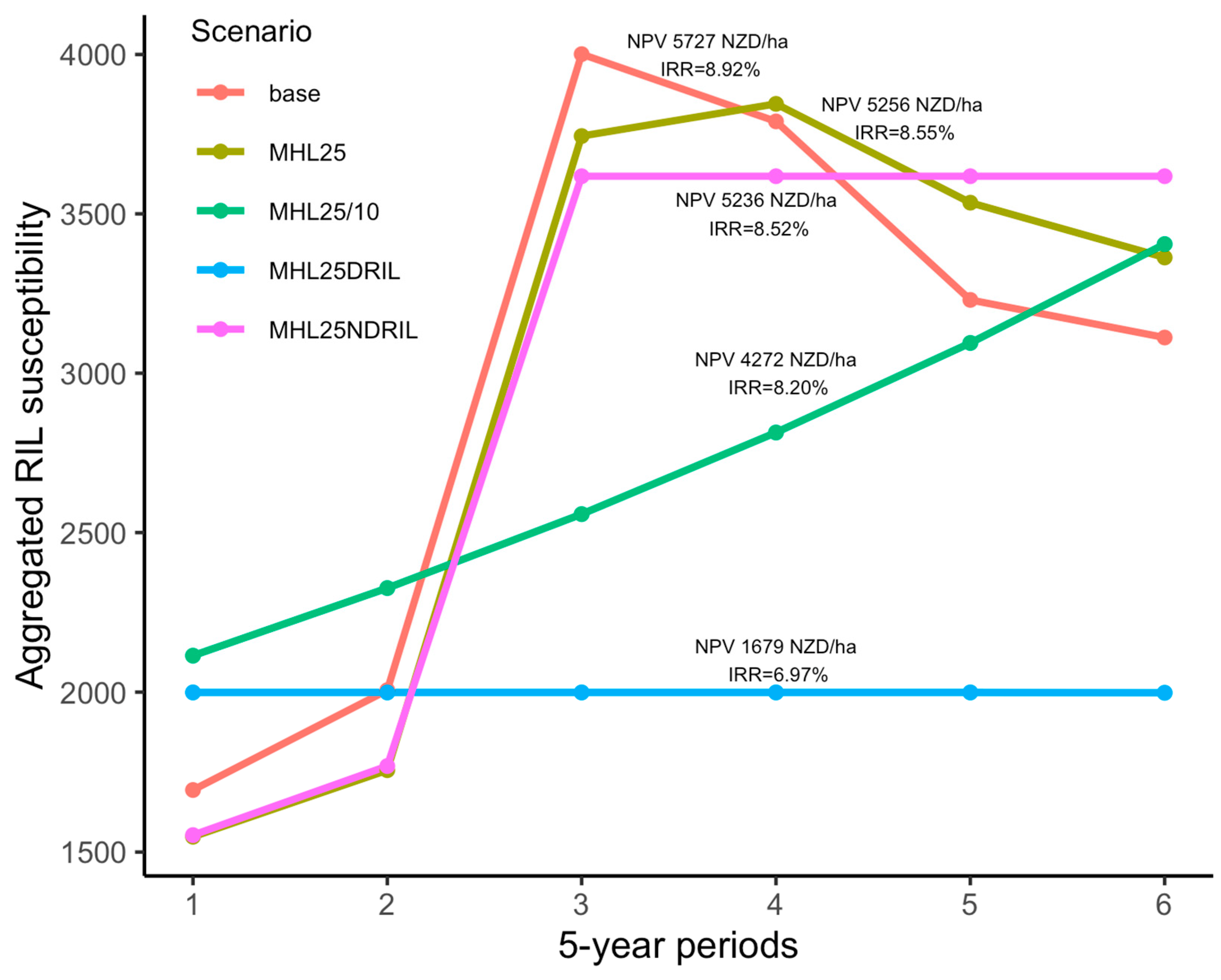 The minimal reduction in profitability when implementing catchment-oriented harvest scheduling is particularly significant given the current regulatory environment in New Zealand. Following Cyclone Gabrielle, stakeholders have called for restrictions on plantation forestry in erosion-prone areas. Our results demonstrate that meaningful reductions in RIL susceptibility can be achieved through spatial and temporal harvest constraints while maintaining commercially viable returns.