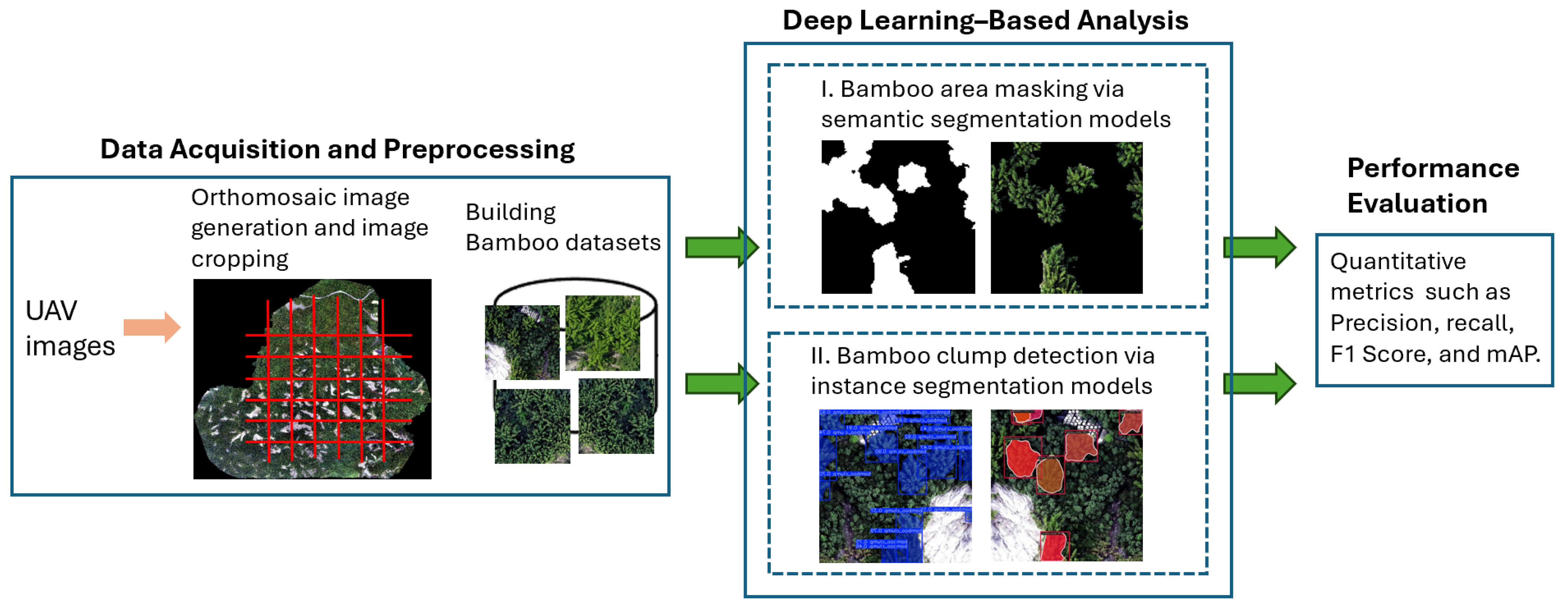 The framework includes three main components: (1) the use of high-resolution UAV RGB orthomosaic imagery as the input data; (2) the application of CNN-based and transformer-based semantic segmentation models, namely U-Net and SegFormer, to extract bamboo forest regions; and (3) the adoption of two instance segmentation models, YOLOv8-Seg and Mask R-CNN, to detect and delineate individual bamboo clumps. This framework is designed to support more effective, scalable, and consistent monitoring of bamboo forest structure and dynamics.