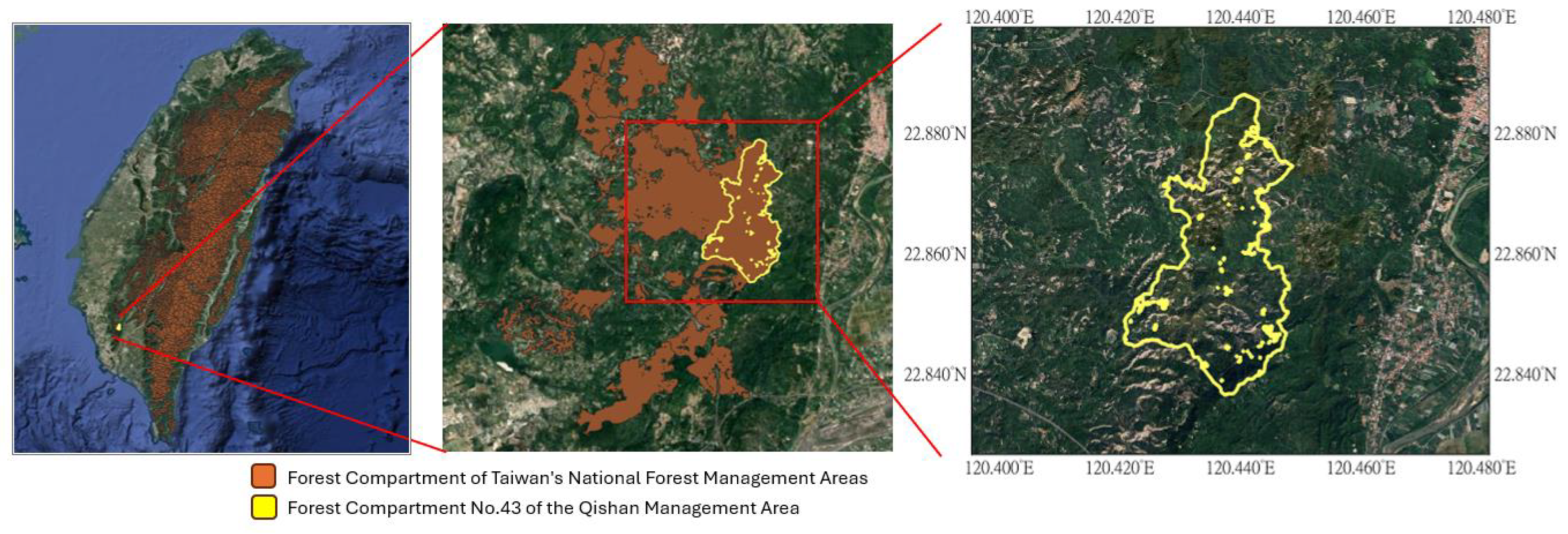 The study area was located in Compartment 43 of the Qishan Working Circle in Kaohsiung City, as shown in
