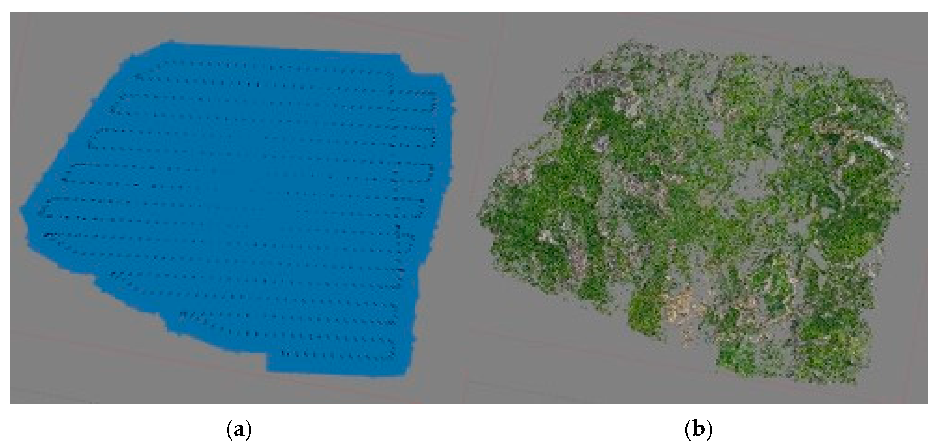 35] (Equations (1) and (2)) were performed by incorporating ground control points (GCPs), IMU data, and tie points extracted from image overlaps. This adjustment process yields refined estimates of the image positions, orientations, and a sparse point cloud.
