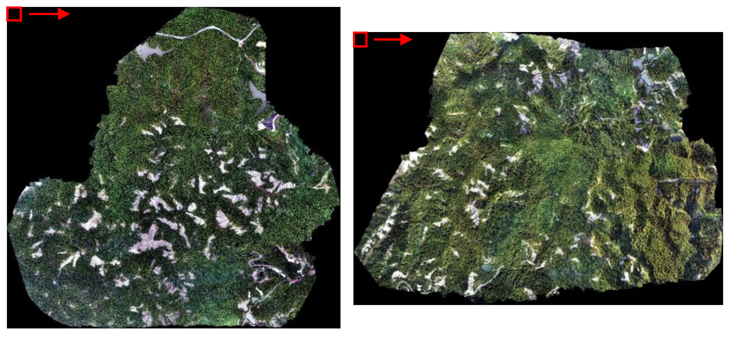 Figure 4 displays the two high-resolution orthomosaic images used in this study. The original image dimensions are 26,673 × 26,595 pixels and 28,211 × 18,788 pixels, respectively. To facilitate model training and inference, a non-overlapping sliding window technique was applied to crop the orthomosaics into multiple sub-images of 1024 × 1024 pixels. A total of 656 sub-images were generated from the first orthomosaic and 571 from the second, resulting in 1227 sub-images forming the initial bamboo dataset.