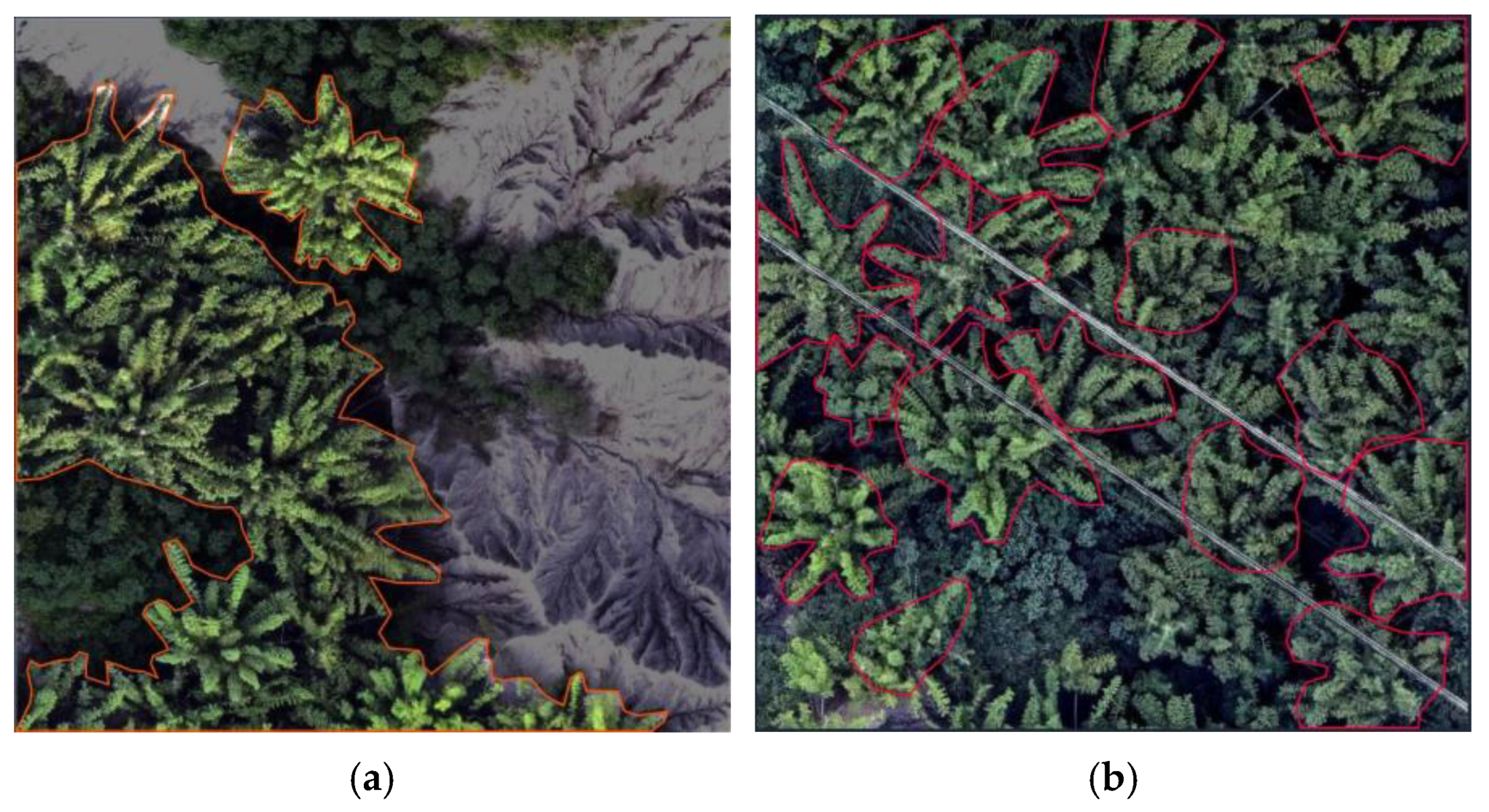 30] proposed an automated tree-crown segmentation and classification system based on UAV RGB imagery and CNNs. Their method successfully identified seven tree categories—including broadleaf, coniferous species, and specific taxa such as