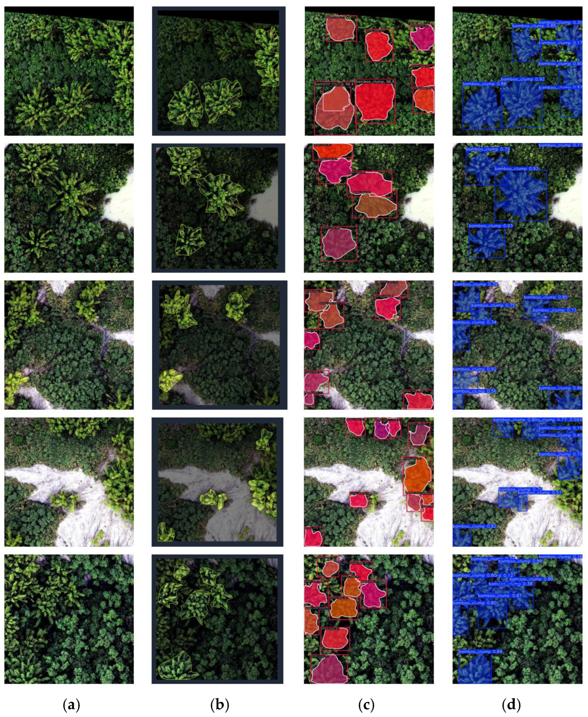 Figure 7 presents qualitative examples of bamboo clump instance segmentation results. From left to right, the columns represent (a) the input UAV test images, (b) the corresponding manually annotated ground truth, (c) the segmentation results generated by Mask R-CNN (Epoch = 12), and (d) those produced by YOLOv8-Seg (Epoch = 200, Batch size = 4). Panels (c) and (d) display both the instance segmentation masks (highlighted regions) and their associated bounding boxes.