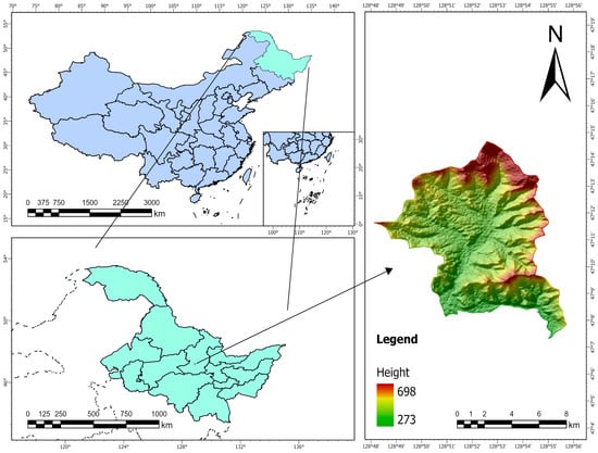 The Liangshui Experimental Forest Farm of Northeast Forestry University, also known as the Liangshui National Nature Reserve, was established in 1958. Situated on the eastern slope of the Dali Dailing branch in the southern section of the Xiao Xing’an Mountains in northeastern China, it spans a total area of 12,133 hm2. Its geographical coordinates range from 128°47′8″ E to 128°57′19″ E and 47°6′49″ N to 47°16′10″ N. Geographically, the reserve lies on the eastern edge of the Eurasian continent and is significantly influenced by a marine climate, exhibiting distinct characteristics of a temperate continental monsoon climate. The area features both pristine forests that have never been harvested and secondary forests that have undergone burning or clearing, representing various stages of forest succession. Additionally, it includes artificial forests of red pine, spruce, larch, and camphor pine, as well as mixed forests of various types. This reserve serves as a true microcosm of the Xiao Xing’an Mountains prior to its development, offering valuable insights into the original “baseline” conditions of the Xiao Xing’an Mountains forest ecosystem (Figure 1).