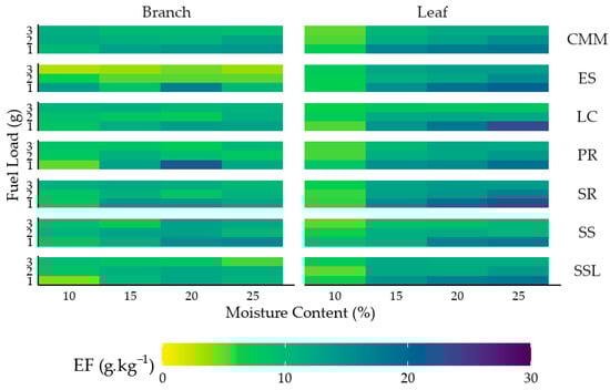 Across all branch panels, color intensity increases along the top-left to bottom-right diagonal, indicating a positive association between moisture content and emission factors and a negative association between fuel load and emission factors within each panel. Moreover, dominant hues are highly similar across species, suggesting minimal species effects on emission factors. Leaf heatmaps exhibit analogous patterns to the branch panels, with overall color intensities that are comparable or nearly identical.