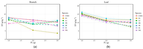 In the branch plots, EFs generally decreased with increasing load, although curve shapes differed among species—likely reflecting variation in branch structure, morphology, or composition. Except for CMM, most species displayed smoother, predominantly broken-line rends, with SSL and PR even showing reversals. In contrast to the less predictable branch patterns, the leaf curves were more consistently downward across species. This aligns with the LMM’s identification of “Part (Leaf)” as a dominant factor with the highest positive effect size (β = 1.2570); LC exhibited an almost linear decline, whereas for the other species the slopes flattened as load increased.