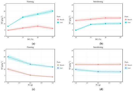 Although increasing fuel load generally raises total PM2.5, excessive loading can exert a counteracting influence [53]; accordingly, the PM2.5 emission factor declines as load increases and its marginal change tapers—a pattern reported by other experimental studies [45]—and a plausible mechanism is that higher loading elevates combustion temperature and efficiency, promoting more complete burning and thus reducing solid-particle release per unit mass. Based on our experimental observations, variables such as fuel diameter may exert a more pronounced influence on emission factors than the interactive effects between branches and other predictors. In contrast to the heterogeneity observed in branch data, leaf emission factors exhibit a more structured and predictable sensitivity to continuous drivers—specifically fuel load and moisture content. This trend underscores the dominant role of organ-specific traits in modulating emission profiles, as further evidenced by the robust interactions identified in our mixed-effects framework.