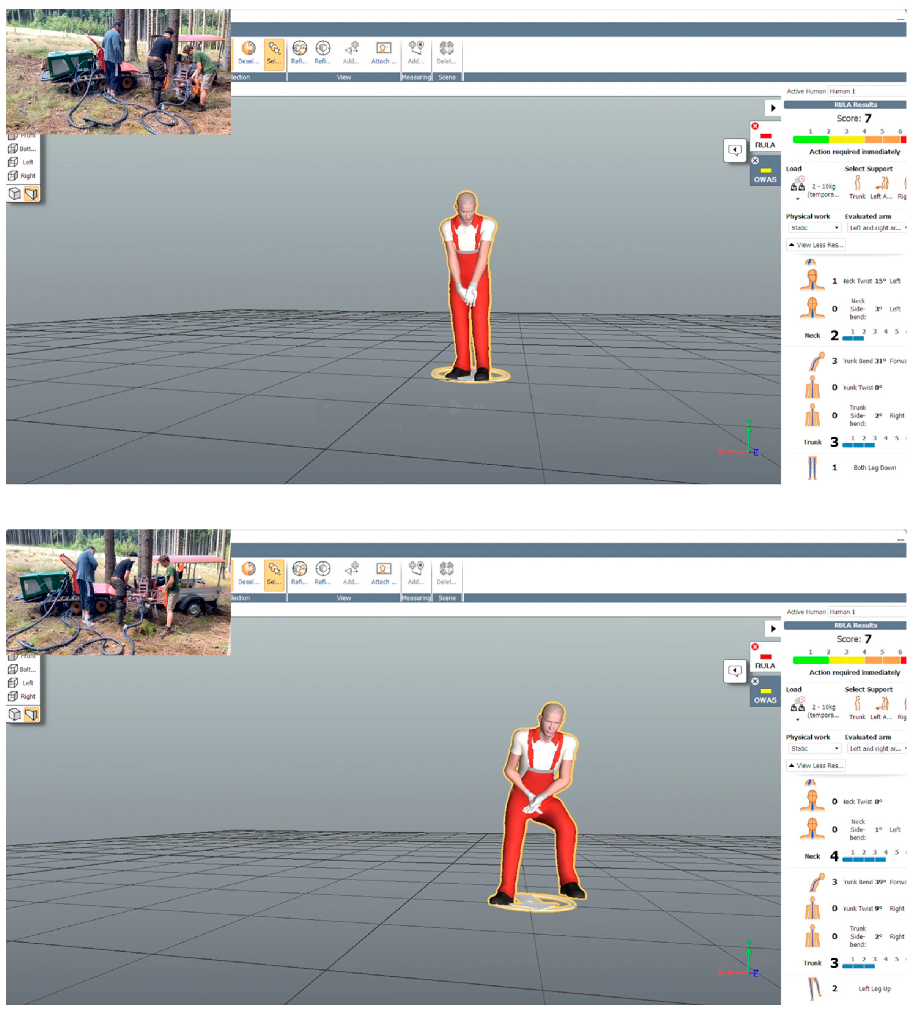 - Ergonomic risk screening using standardized scoring (RULA and OWAS) for representative postures within each phase;