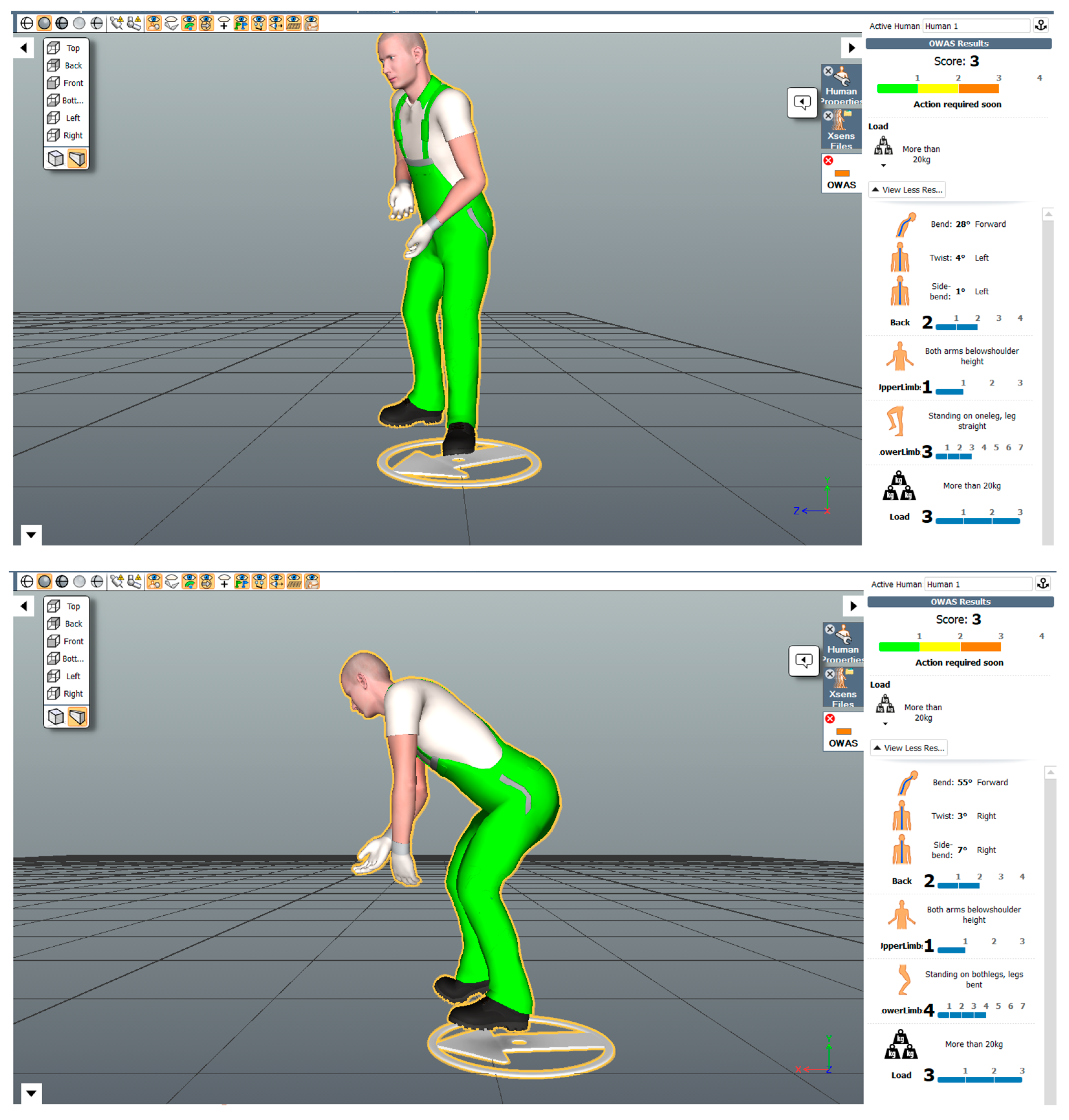 | Install/Dismantle | Deep trunk flexion + rotation during manipulation | Phase peaks in trunk flexion/rotation; high action levels in posture screening | Add/optimize trunk support points and reduce forward reach; define work-height and reach envelope | Reduced lumbar loading drivers and shorter exposure to extreme trunk postures |