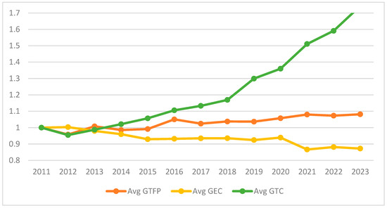 GTC (technological change) captures the “innovation effect” from the outward shift in the production frontier itself. GTC > 1 indicates the occurrence of green technological progress, whereas GTC < 1 indicates technological regress.