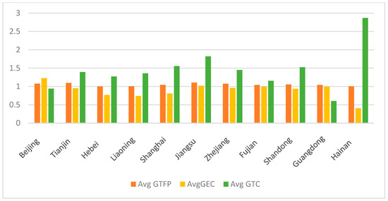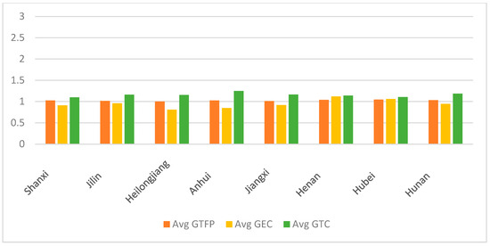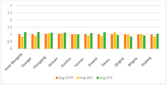 Based on the classification method following Shen et al. (2021) [38], 30 provinces in China are categorized into eastern, central, and western regions for analyzing the GTFP and its decomposition from 2011 to 2023. Figure 3, Figure 4 and Figure 5 show that the eastern region leads in GTFP growth (1.049), followed by the central (1.025) and western (1.013) regions. This hierarchy primarily stems from technological progress (GTC), where the eastern region demonstrates a substantial advantage (1.449) over the central (1.158) and western (1.051) regions. The eastern provinces generally exhibit higher GTC values, particularly in technologically advanced regions like Jiangsu and Guangdong. Conversely, technical efficiency change (GEC) shows an inverse trend, with the western region recording the highest efficiency (0.971), followed by the central (0.947) and eastern (0.892) regions. This pattern indicates that the eastern region’s growth is predominantly driven by technological innovation yet hampered by declining efficiency, potentially due to rapid technological adoption outpacing managerial and operational adaptations. The western region, while maintaining relatively better efficiency, suffers from slower technological advancement, reflecting a reliance on policy support rather than endogenous innovation. The central region strikes a middle ground, benefiting from industrial transfer and moderate technological progress. Future policies should therefore emphasize balanced strategies that not only foster green technology innovation but also address efficiency bottlenecks through improved resource allocation and institutional reforms.
