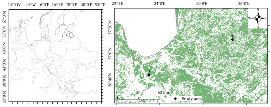 The study area is located in the hemiboreal forest zone in Latvia (Figure 1), where approximately 50% of the territory is covered by forests, about 10% of which are situated on periodically waterlogged mineral soils [34]. The forest stand age and structure, as well as the forest landscape of Latvia, are notably fragmented and formed by a mixture of forest patches and agricultural land [34]. Birch (Betula spp.), Scots pine (Pinus sylvestris L.), and Norway spruce (Picea abies (L.) H.Karst.) are the most economically important tree species, forming both pure and mixed stands and accounting for approximately 76% of the total standing volume [34]. About 10% of the standing volume of birch, pine, and spruce is found in stands on periodically waterlogged mineral soils [34].