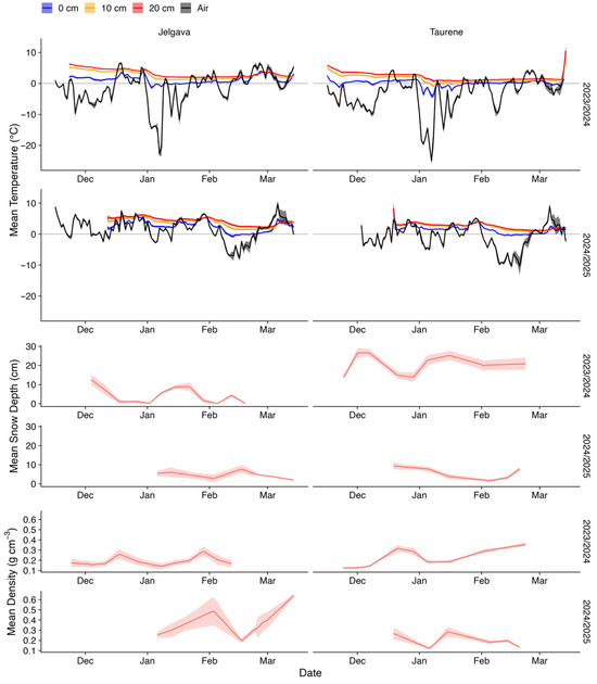 Mean temperature of air and soil at three depths (0, 10, and 20 cm), and mean depth (snow cover thickness (SCT)) and density of snow within forest stands managed by the Forest Research Station near Jelgava (central Latvia) and Taurene (eastern Latvia) during the seasons of 2023/2024 and 2024/2025. The coloured area indicates 95% confidence interval.