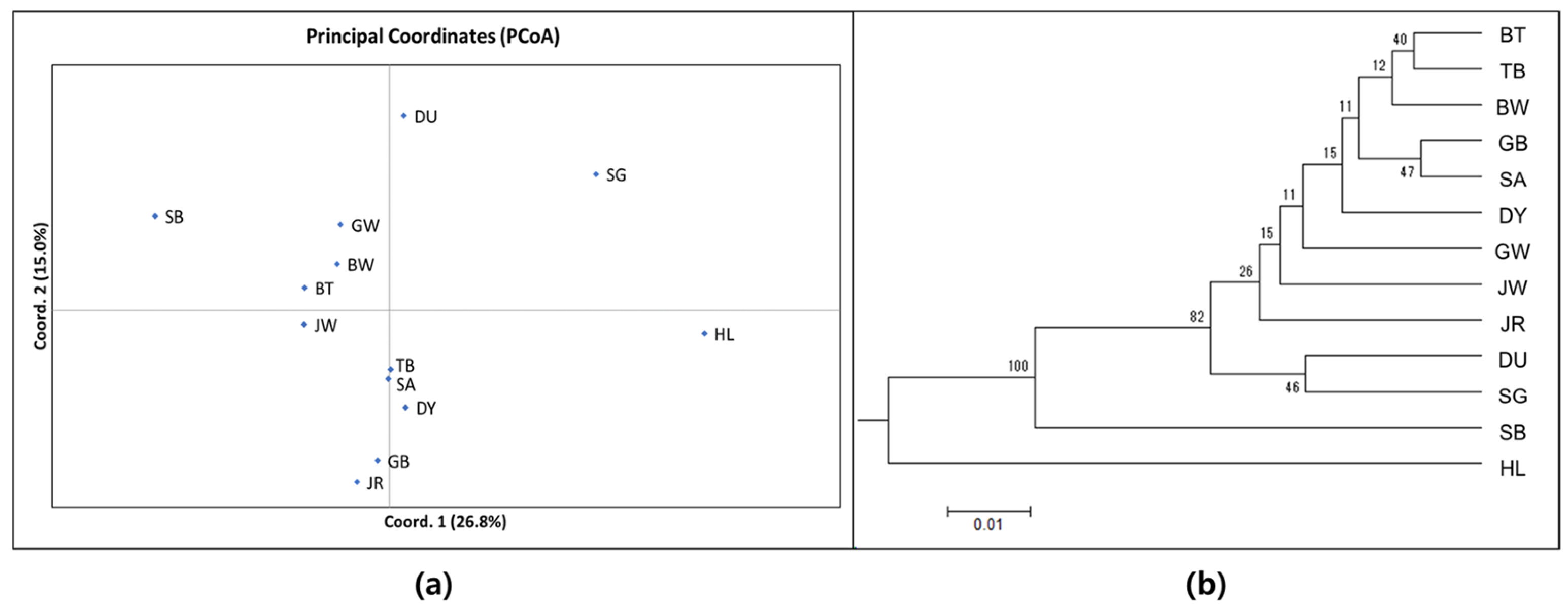 - Peakall, R.; Smouse, P.E. GenAlEx 6.5: Genetic analysis in Excel. Population genetic software for teaching and research—An update. Bioinformatics 2012, 28, 2537–2539. [Google Scholar] [CrossRef]