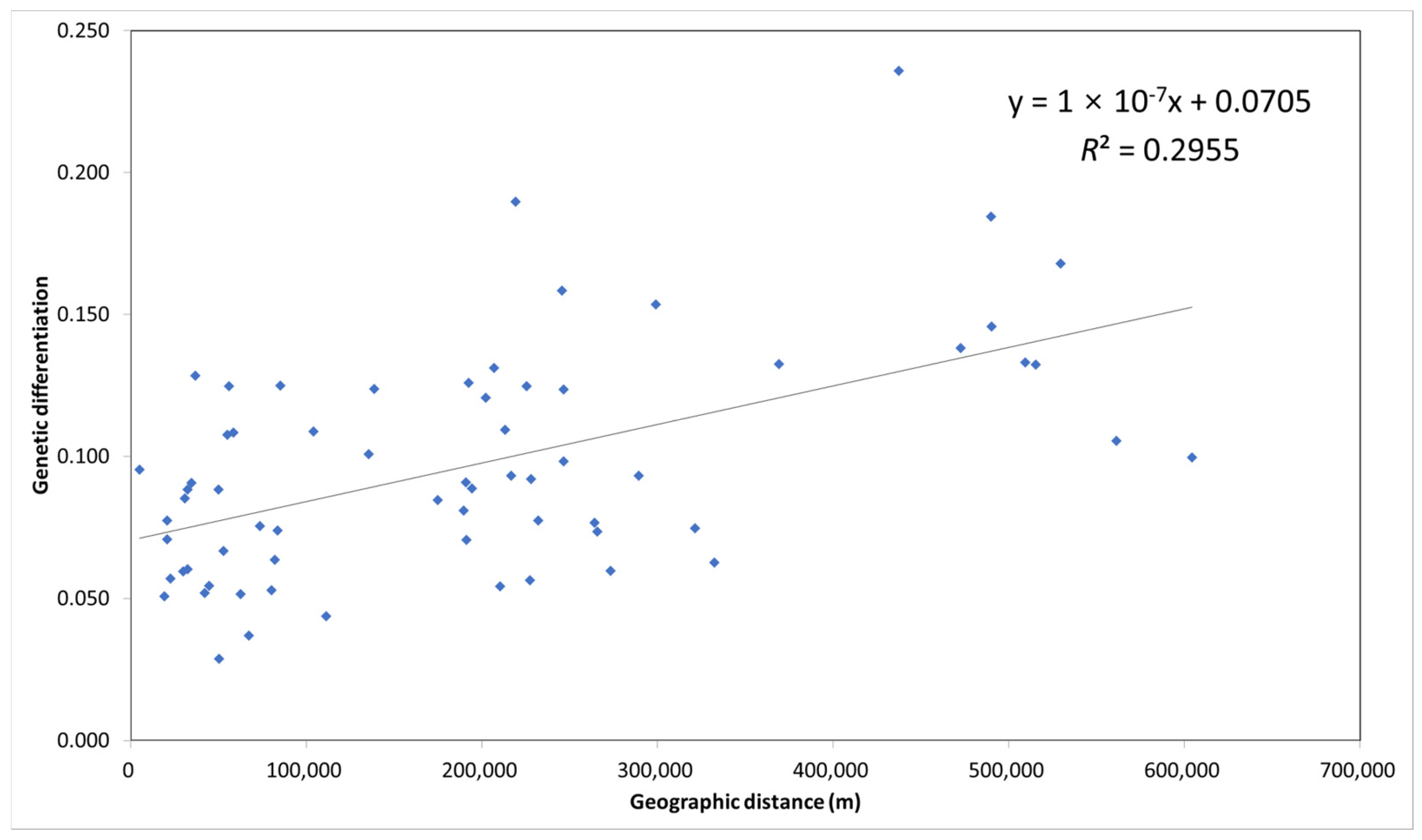 - Meirmans, P.G.; Hedrick, P.W. Assessing population structure: FST and related measures. Mol. Ecol. Resour. 2011, 11, 5–18. [Google Scholar] [CrossRef] [PubMed]