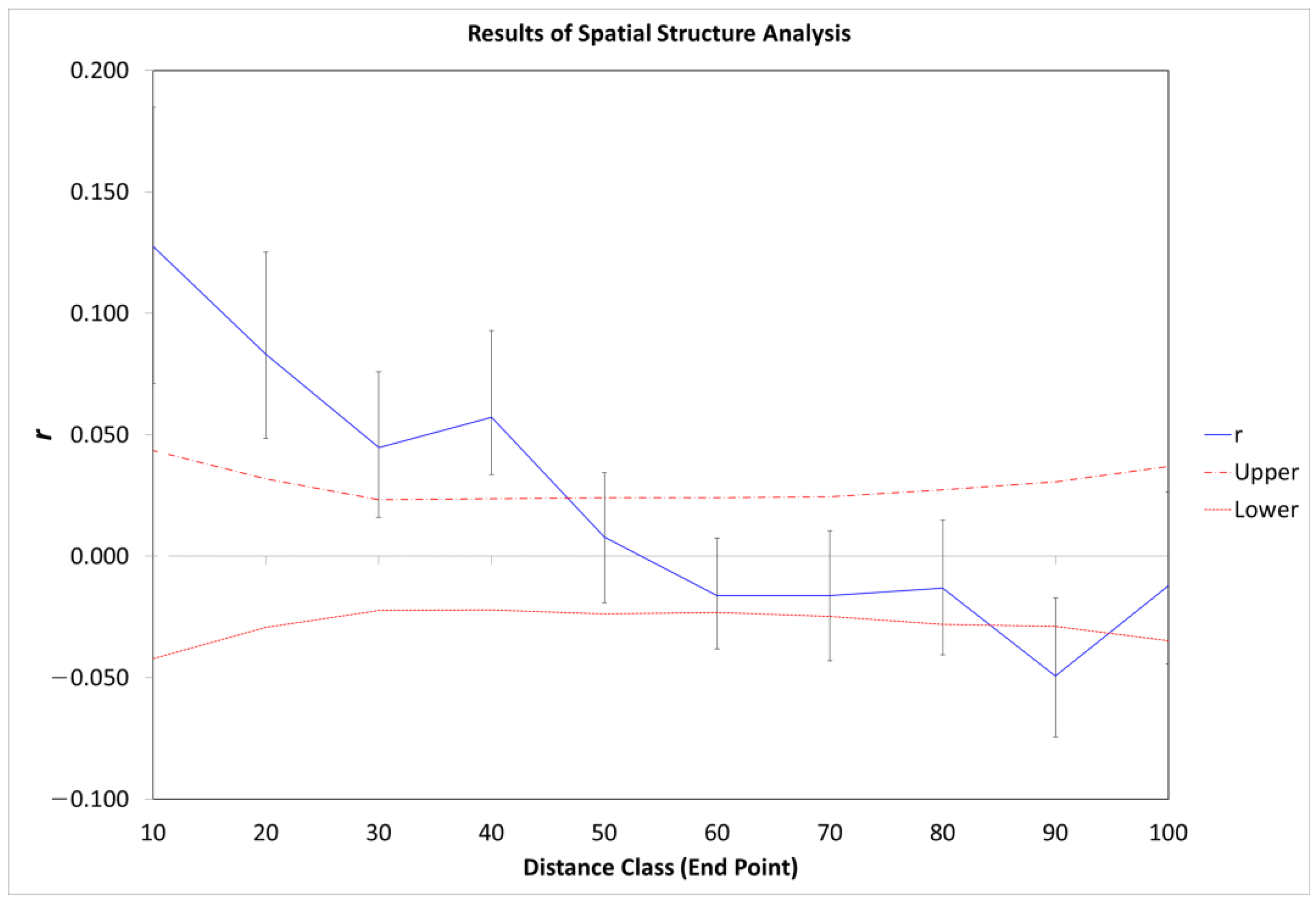 - Smouse, P.E.; Peakall, R.O.D. Spatial autocorrelation analysis of individual multiallele and multilocus genetic structure. Heredity 1999, 82, 561–573. [Google Scholar] [CrossRef]