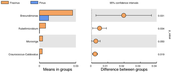 To identify key taxa driving the differences between tree species, a t-test was performed to compare the presented endophytic genera between Fraxinus excelsior and Pinus nigra (Figure 4). The results revealed four genera—Brevundimonas, Rubellimicrobium, Microvirga, and Craurococcus caldovatus—that were significantly more abundant in F. excelsior (p-values ranging from 0.019 to 0.050). Among them, Brevundimonas showed the greatest difference in relative abundance and statistical significance (p = 0.031). These genera are known to possess traits relevant to plant interaction, for example related to nitrogen and phosphate cycles, as well as to antioxidant production [30,31], suggesting that Fraxinus may preferentially select beneficial microbes under urban environmental conditions.