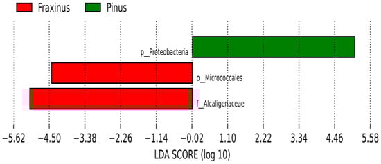 A histogram of linear discriminant analysis (LDA) scores from LEfSe identifying microbial taxa that significantly differentiate endophytic communities of Fraxinus excelsior (red) and Pinus nigra (green). Only taxa with a significant difference and LDA score >2.0 (log10) are shown. Taxa enriched in Pinus include the phylum Proteobacteria, while those enriched in Fraxinus include the order Micrococcales and the family Alcaligenaceae.
