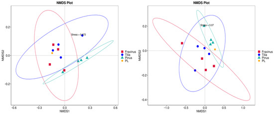 Non-metric multidimensional scaling (NMDS) plots based on OTU-level Bray–Curtis dissimilarity showing clustering of endophytic microbiomes from studied tree species (Fraxinus excelsior—red, Tilia tomentosa—blue, and Pinus nigra—turquoise) and a pooled reference sample (PL—yellow) collected in urban plots in the city of Plovdiv, Bulgaria. Points represented tree samples, ellipses indicated the 95% confidence intervals for group clustering. The stress values (0.072 and 0.070) indicate good representation of the data in two-dimensional space.