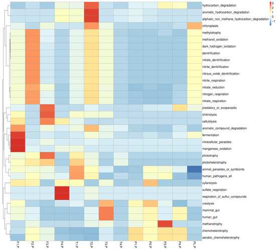 Functional predictions were conducted using the FAPROTAX [29] based on information on bacterial taxonomy. A z-score normalised heatmap of the top 35 most abundant functions was generated using R software version 4.2.1. Functional clustering was performed to elucidate ecological roles across samples, focusing on nitrogen cycling, carbon metabolism, and pollutant degradation.