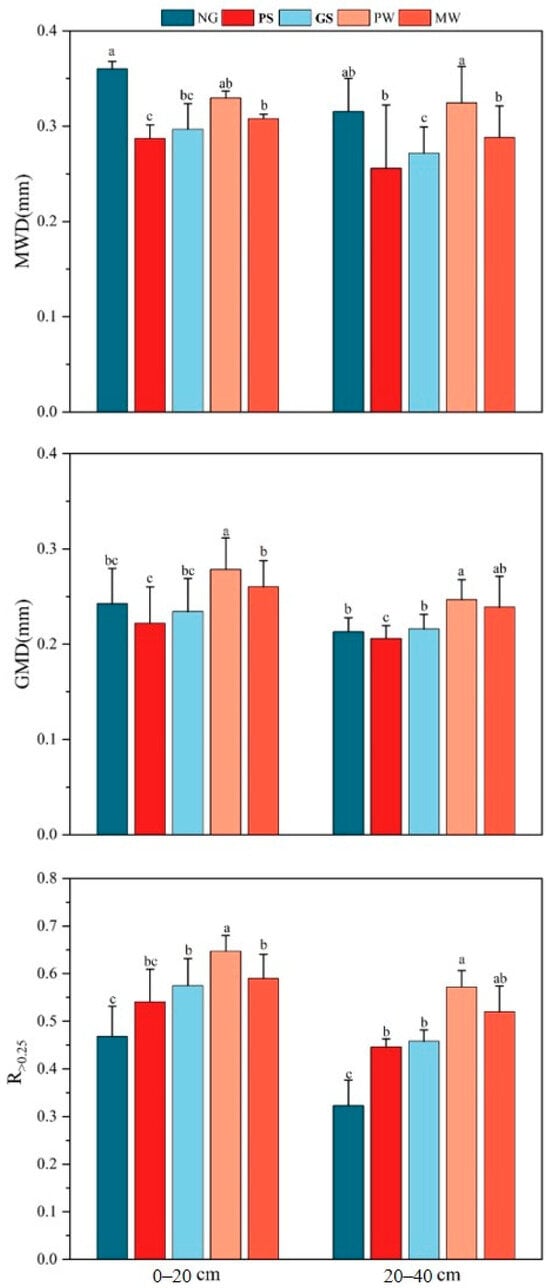 One-way ANOVA results for the soil aggregate stability under different vegetation types. MWD: mean weight diameter, GMD: geometric mean diameter, R>0.25: the proportion of aggregates larger than 0.25 mm. Lowercase letters denote statistically significant differences across vegetation types (p < 0.05). Note: NG: natural grassland, PS: pure shrubland, GS: mixed grass-shrubland, PW: pure woodland, MW: mixed woodland. Error bars represent standard errors of the means (n = 3).
