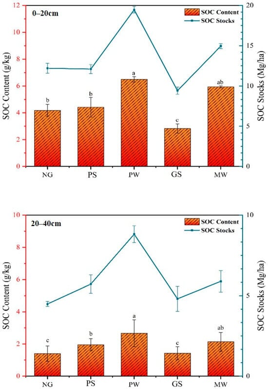 The soil organic carbon content (g kg−1) and stocks (Mg ha−1) under different vegetation types. Different lowercase letters indicate statistically significant differences across different vegetation types (p < 0.05). Note: NG: natural grassland, PS: pure shrubland, GS: mixed grass-shrubland, PW: pure woodland, MW: mixed woodland. Error bars indicate the standard error of the mean (n = 3).