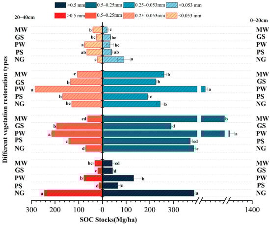 Vegetation type and soil depth significantly affected SOC stocks in soil aggregates (Figure 4). Among the five vegetation types and two soil layers, SOC stocks were highest in macroaggregates (>0.25 mm) and lowest in the silt + clay fraction. In the 0–20 cm layer, SOC stocks in the macroaggregates were lowest in GS and highest in NG, whereas SOC stocks in the microaggregates were highest in PW and those in the silt + clay fraction were highest in NG. In the 20–40 cm layer, SOC stocks in the macroaggregates were lowest in MW and highest in NG, while SOC stocks in both the microaggregates and the silt + clay fraction were highest in PW. SOC stocks in the macroaggregates and microaggregates were greater at 0–20 cm than at 20–40 cm. In contrast, SOC stocks in the silt + clay fraction of the artificially restored sites (PS, PW, and MW) were greater at 20–40 cm than at 0–20 cm, whereas SOC stocks in the silt + clay fraction of NG displayed the opposite trend.