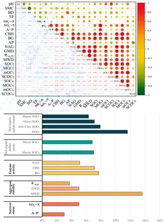 Spearman correlation and random forest analysis were conducted on soil nutrient status, enzyme activities, aggregate stability, SOC content and stocks in bulk soil and aggregates (n = 6). Red denotes positive correlations, green denotes negative correlations, and the color shading indicates * p < 0.05. The histograms illustrated the extent of variation in the overall interpretation of SOC stocks caused by each influencing factor, as determined through random forest analysis. BG: β-1,4-glucosidase, CBH: cellobio-hydrolase, NAG: β-1,4-N-acetyl-glucosaminnidase, AP: alkaline phosphatase, A-P: available P; NO4+-N; ammonium nitrogen; NO3−-N; nitrate nitrogen; GMD: geometric mean diameter, MWD: mean weight diameter, SOC: soil organic carbon, MOCt: macroaggregate organic carbon content (g kg−1), mOCt: microaggregate organic carbon content (g kg−1), SCOCt: Silt + Clay particles organic carbon content (g kg−1), SOCt: soil organic carbon content in bulk soil (g kg−1), MOCs: macroaggregate organic carbon stocks (Mg ha−1), mOCs: microaggregate organic carbon stocks (Mg ha−1), SCOCs: Silt + Clay particles organic carbon stocks (Mg ha−1), SOCs: soil organic carbon stocks in bulk soil (Mg ha−1).