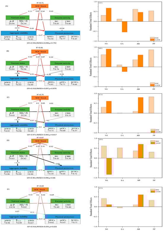 Structural equation model (SEM) analysis was conducted to investigate the regulation of SOC stocks in bulk soil and in aggregates by soil nutrient status, enzyme activities and aggregate stability, as well as the physical protection of aggregates under GS, mixed grass-shrubland (A,A1); PS, pure shrubland (B,B1); PW, pure woodland (C,C1); MW, mixed woodland (D,D1) and NG, natural grassland (E,E1). Square boxes indicate variables included in the model (n = 6). BG: β-glucosidase; CBH: cellobio-hydrolase; MOCs, mOCs and SCOCs: the soil organic carbon stocks in macroaggregates, microaggregates and silt + clay particles, respectively. GMD: geometric mean diameter, MWD: mean weight diameter; A-P: available P; NO3−-N: Nitrate nitrogen; SOC, soil organic carbon; AAOC, aggregate associated organic carbon. Arrow width reflects the significance of the relationship; red arrows indicate positive correlations, whereas black arrows indicate negative correlations. Values adjacent to the arrows represent the effect size of each relationship, and arrow thickness corresponds to the magnitude of the path coefficient. The symbols of ‘↑’ and ‘↓’ mean the positive and negative of the normalized load coefficient. R2 values indicate the percentage of variance accounted for in each endogenous variable. GFI denotes the goodness-of-fit index, and RMSEA refers to the root mean square error of approximation.