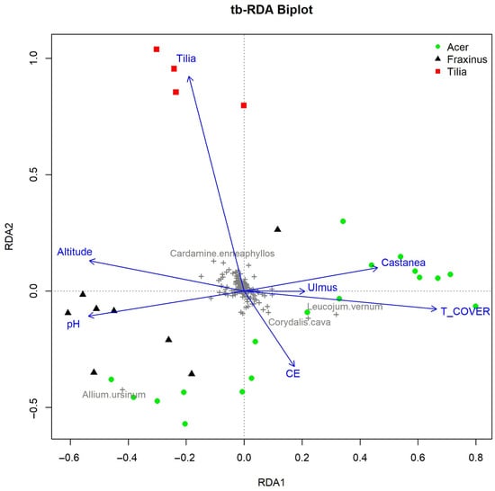 The vector of T_COVER is opposite to the vector of altitude, which indicates that tree layer cover was on average higher at lower altitudes. The vector of the Castanea sativa growing stock also indicates a higher proportion of this species in Acer-dominated stands at lower altitudes. These stands, which are admixed with Castanea sativa, grow in more acidic soils (lower pH). However, other Acer stands admixed with different broadleaves are found at higher altitudes and in soils with a higher pH (less acidic) on carbonate bedrock. Among the early spring ephemeral herbs, Corydalis cava (L.) Schweigg. & Körte and Leucojum vernum L. are indicative of Acer forests at lower altitudes. Cardamine enneaphyllos (L.) Crantz is a more characteristic species of forests at higher altitudes, while Allium ursinum L. is more abundant in Fraxinus and Acer plots on the left side of the RDA biplot (at higher altitudes).