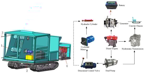 The complex terrain of hilly and steep forests results in high labor intensity and a lack of suitable machinery for post-harvest moso bamboo transportation. To address this issue, a modular and low-cost cable-type moso bamboo transportation equipment was innovatively designed based on the terrain characteristics and mechanized transportation requirements of moso bamboo. This equipment can adapt to complex mountainous environments and effectively improve the transportation efficiency of moso bamboo in challenging forest conditions [3]. The equipment mainly consists of a power module, supporting components, and a circulating wire rope. The overall structure of the equipment is shown in Figure 1, and the main technical parameters of the equipment are shown in Table 1. Among them, the power module is composed of a crawler chassis, an engine, a hydraulic transmission system, and a wire-rope-driven device. The engine provides power to two subsystems: one is connected to the hydrostatic transmission (HST) system to drive the crawler chassis, and the other delivers power to the wire-rope-driven device through a hydraulic pump and a valve group. This configuration enables the equipment to perform movement, steering, wire rope traction, and reciprocating circulation functions. The overall structure of the power module is shown in Figure 2.