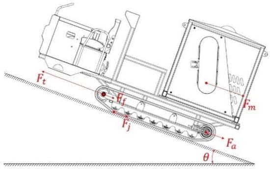 where is the rolling resistance coefficient which was taken as 0.37 [10,12]; is the slope angle which was taken as 30°; is the wire rope resistance which was taken as 10,000 N; is the mass of the power chassis which was 1875 kg; g is the gravitational acceleration which was 9.8 m/s2; is the mass increment coefficient which was taken as 1.3 [14]; is the travel acceleration which was taken as 0.8 m/s2.