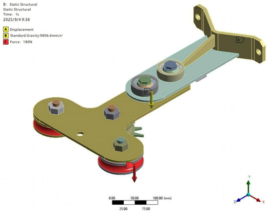 The model was discretized by using Solid186 high-order 3D solid elements. Each element is a 20-node hexahedral solid with quadratic displacement functions, which can effectively capture nonlinear contact, stress concentration, and bending behavior [27]. During mesh generation, the Patch Conforming meshing method was employed. Local mesh refinement was applied to critical areas, such as bolt hole edges, transition zones of the supporting plate, and roller contact surfaces, to enhance computational accuracy in regions of stress concentration. The overall average element size was approximately 5 mm, while the refined mesh size in critical areas was about 2 mm. The meshing results are shown in Figure 10, where the mesh distribution appears relatively uniform with noticeable refinement in key regions. The model consists of approximately 126,000 elements and 235,000 nodes in total. The supporting components are primarily subjected to two types of loads during operation: self-weight and external loading. The self-weight is uniformly applied to all parts to simulate the static response of the structure under its own gravity, acting along the negative Y-axis direction. During the moso bamboo transportation process, contact between the rollers and the track produces a significant localized force. To simplify the computation, this contact force was converted into an equivalent concentrated load of 180 N, applied to the roller–support contact region, also acting vertically downward, as illustrated in Figure 11.