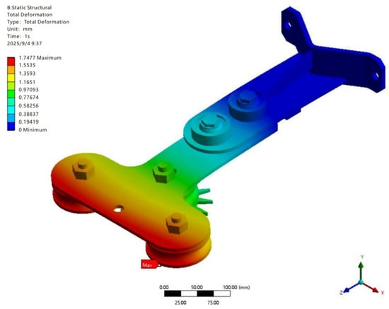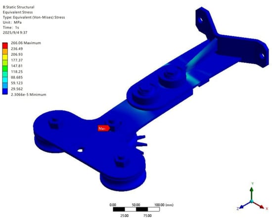 The overall deformation contour is shown in Figure 12. Under the combined action of the 180 N external load and self-weight, the supporting component exhibits a certain degree of flexural deformation. The maximum deformation is 1.7477 mm, occurring in the contact region between the lower roller and the track, while the deformation in the upper fixed beam region is nearly zero, consistent with the expected rigid boundary constraint. The deformation gradually increases from top to bottom, indicating that the load is mainly transmitted to the body of the supporting component through the rollers. The overall deformation magnitude is relatively small and does not adversely affect the structural function or normal operation of the system. The Von Mises equivalent stress distribution is shown in Figure 13. The maximum stress reaches 266.06 MPa, primarily concentrated around the central bolt hole region, whereas most other areas exhibit stresses below 100 MPa, indicating a generally low stress level. Stress concentration occurs locally at the connection joints and transition regions. Compared with the yield strength of Q345 structural steel (345 MPa), the stress level in the majority of the main structure remains within a safe range.
