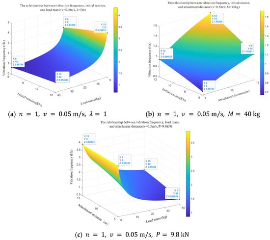 The first-order vibration of the wire rope has the maximum energy and the lowest frequency, which has the greatest impact on the stability of the wire rope’s operation. Therefore, this study only considers the relationship between the first-order vibration frequency and the load mass, attachment distance, and initial tension. The numerical simulation results are shown in Figure 17.