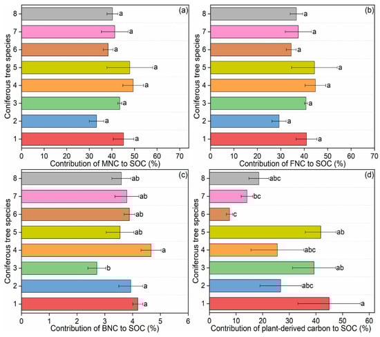 Contribution of microbial necromass carbon and plant-derived carbon to SOC in coniferous forest soils: (a) contribution of microbial necromass carbon (MNC) to soil organic carbon (SOC); (b) contribution of fungal necromass carbon (FNC) to SOC; (c) contribution of bacterial necromass carbon (BNC) to SOC; (d) contribution of plant-derived carbon to SOC. Data are presented as mean ± standard error (SE). Significant differences among different coniferous tree species are indicated by different letters at the 0.05 level. Abbreviations: 1: Pinus armandii; 2: Larix gmelinii var. principis-rupprechtii; 3: Abies fargesii var. faxoniana; 4: Pinus tabuliformis; 5: Picea asperata; 6: Larix kaempferi; 7: Tsuga chinensis; 8: Larix potaninii.