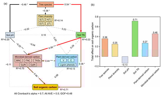 Results of PLS-PM (a) and total effects on soil organic carbon (b). The red and black lines represent positive and negative effects, respectively, and gray dash line represents insignificant effects. * and *** indicate p < 0.05 and p < 0.001, respectively. Abbreviations: S(T), H(T), D(T), J(T): species richness, Shannon–Wiener diversity index, Simpson diversity index, Pielou evenness index of the trees; TN: total nitrogen; V: vanillyl; C: cinnamyl; MNC: microbial necromass carbon; FNC: fungal necromass carbon; TASs: total amino sugars concentrations; GluN: glucosamine; GalN: galactosamine; SOC: soil organic carbon; AVE: average variance extracted; GOF: goodness-of-fit.
